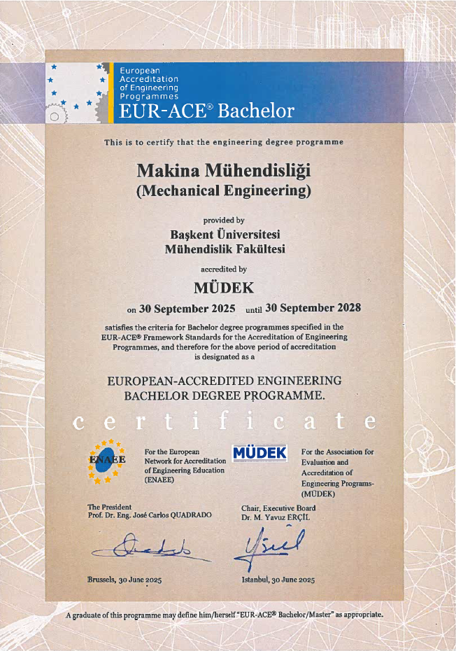 Makine Mühendisliği bölümümüz MÜDEK (Mühendislik Eğitim Programları Değerlendirme ve Akreditasyon Derneği tarafından akredite edilmiştir.